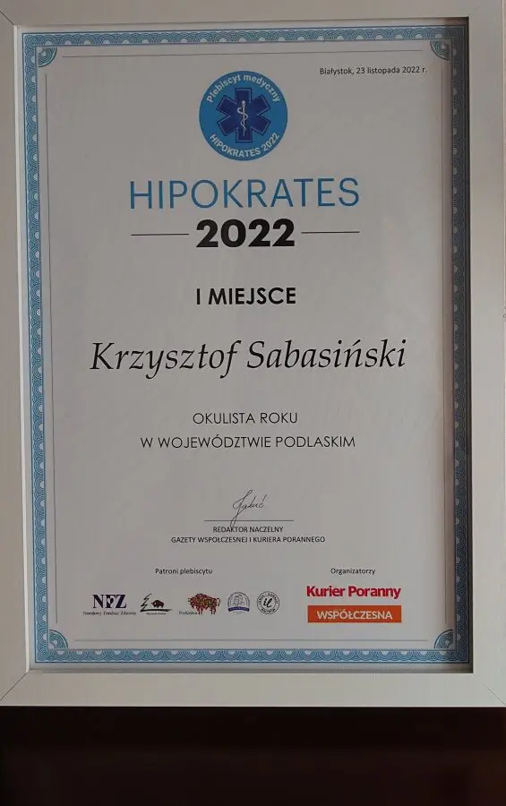 Jakość usług potwierdzona jest licznymi nagrodami, do których należą m.in. Laur Pacjenta 2013 oraz Certyfikat Jakości serwisu Znany Lekarz przyznany w 2016 oraz 2017 roku. Z dumą i radością informuję, że głosami pacjentów zostałem laureatem konkursu Hipokrates 2022 w kategorii Okulista Roku województwa podlaskiego, w roku 2023 zająłem miejsce drugie.